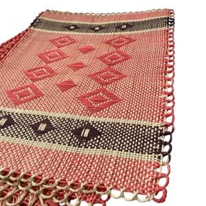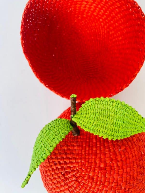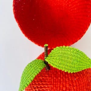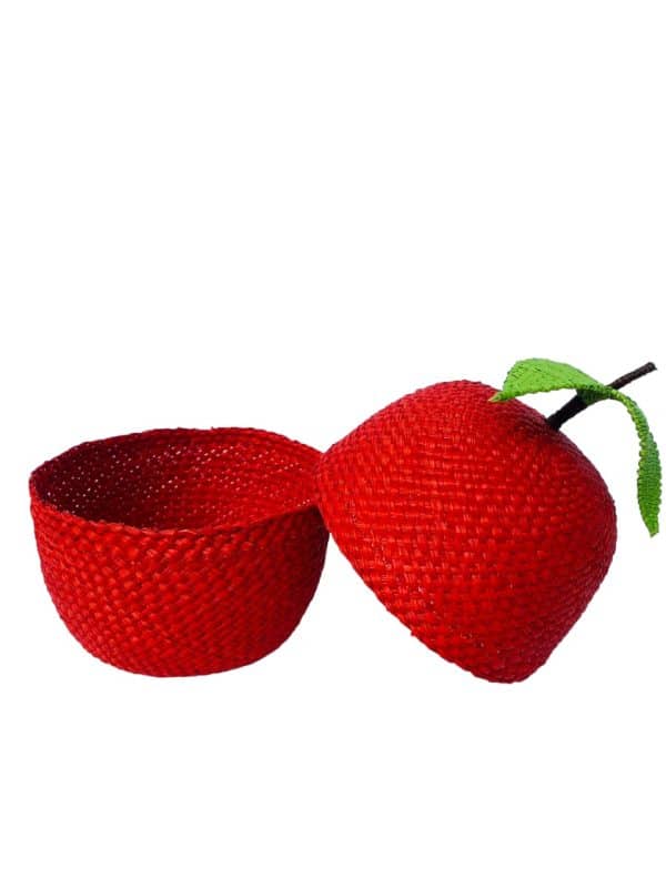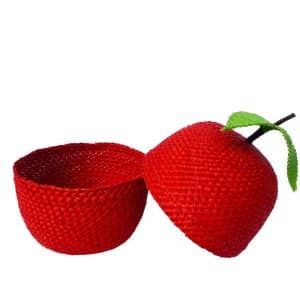 Contenedor en forma de fruta, elaborado en fibra de palma de iraca, forma ovalada con tapa, color rojo con verde, ideal para organizar y conservar productos de cocina.