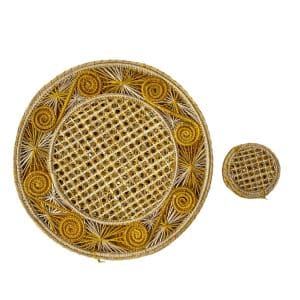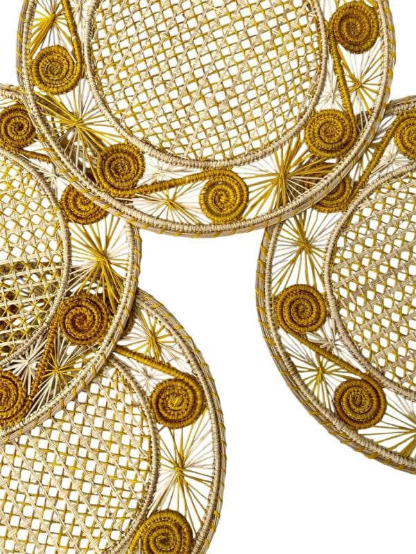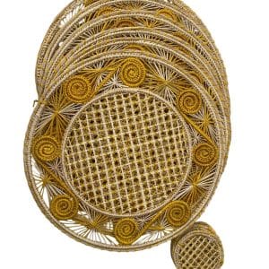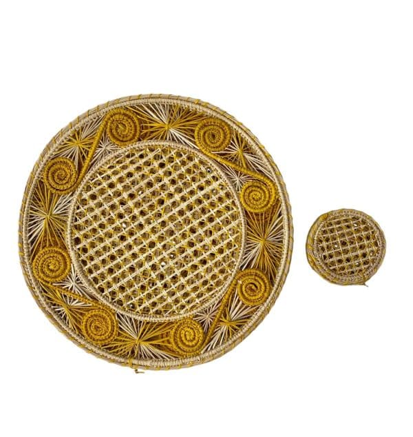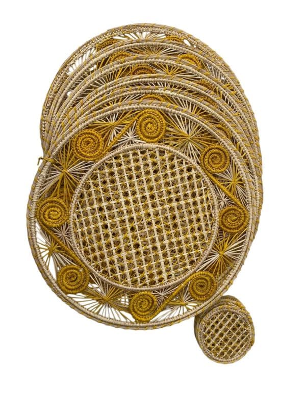 Individual para mesa elaborado en fibra de palma iraca, color amarillo. 6 unidades de individual, 6 unidades de portavasos